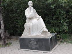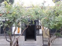 在槐蔭掩映下,我來到了蒲松齡紀念館。門廳有蒲翁的白石頭像,進入前院,綠竹猗猗,在蒲松齡生平陳列室前又有一座蒲翁的全身坐像,左手拿扇,右手捻鬚,神態自若。我急於去看他的故居,就穿過兩重縱長八角形的洞門跨進後院。只見前方屋前有兩棵結實纍纍的石榴樹,知道這就是三百多年前的蒲氏舊宅----聊齋了。 |