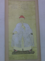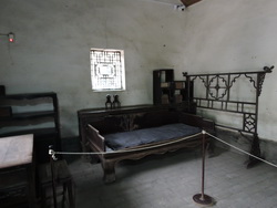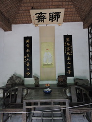 畫像的案桌上放了四件蒲松齡在西鋪畢家坐館時的遺物,包括靈璧石、三星石、蛙鳴石和木影爐,雖不是什麼珍寶,卻也留著蒲翁平日摩挲撫弄時的手澤啊。左側的廂房是書房,有臥榻、書櫥、桌椅、帽架等,據說都是蒲翁的舊物;左側的廂房才是臥室,他在71歲撤帳歸家,可惜為他持家五十多年的劉氏早他而逝,兩年後,孤獨的蒲翁就在此臥室「倚窗危坐而卒」,死前可能還在構思他的狐鬼精魅的故事呢。 |