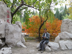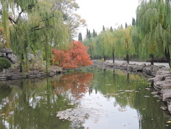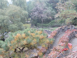 進園後,沿著一段城牆往下走,牆頭纏滿暗紅的爬山虎,城下的矮松已綠中變黃了,在一片綠楊中夾著兩株已結果的柿樹,濃濃的秋色撲面而來,這一段叫做柳泉古道。
