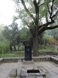 走完柳泉古道,就見前面一叢柳樹,綠浪輕搖,當中屹立一棵老柳樹,樹下有一口四方的井,這就是柳泉了。柳泉原名滿井,據說當年位於青州至濟南的官道上,道旁有一個草亭,蒲松齡就在亭中設茶款客,請求過路人說說所知的奇聞逸事。現在柳泉上立了一塊黑底藍字的石碑,由作家茅盾題字;柳泉外也建了一座采風亭,蒲翁正坐在亭內拈鬚頷首,似在聆聽客人在談奇說怪呢。 |