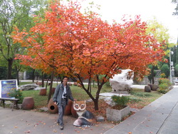 從柳泉續往東行,樹木綠中有黃,甚至夾雜全株紅、橙,色彩斑斕,怡人心目。路邊相隔不遠就有一小亭,亭內有枱、椅,亭上掛了「連城」、「嬌娜」、「青鳳」、「畫皮」等木額,似在提醒遊人已進入聊齋的狐鬼世界。 |