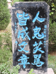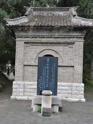過了觀狐園後,轉往南行。只見柏樹夾道,未幾就到了蒲松齡墓園。其實這是蒲氏幾代人的墓地,收葬了蒲松齡的先祖及後人。蒲松齡的墓封土高約2米,前面有四角碑亭,亭中鐫刻同邑張元所寫的墓表,前面又立了茅盾手書的墓碑。蒲墓在文革期間曾被破壞,茅盾在碑上也作了紀錄,讀之令人扼腕﹗ |