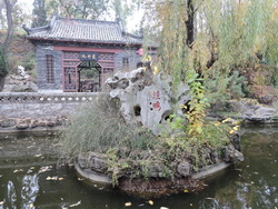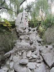 最使我驚喜的是園中有園,那就是按王村西鋪畢自嚴的私園所重建的「石隱園」,蒲松齡在畢家設館達三十年,經常在園中留連,其中景物也見於歌詠。進了園 後,令我應接不暇的是層出不窮的石峰,如萬笏山、魚躍石、蛙鳴石、雨錢石等,這使我猛然明白蒲翁為什麼會寫了一篇《石清虛》,相信他和畢家主人都是石癡呢﹗ |