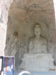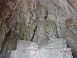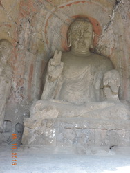 跟著參觀賓陽三洞。中洞開鑿於北魏,供奉釋迦牟尼坐像,有弟子和菩薩侍側,佛相慈祥,更嘴角含笑。 |